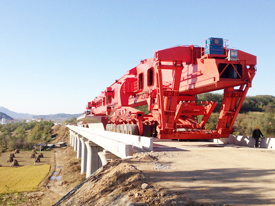 以及生產更新運架產品能架設跨度40M高速鐵路箱梁的:SXJ1000T/40M一跨式架橋機(配套攀爬式運梁車可以實現過隧道零距離架梁)和攀爬式運梁車。并能對現有32M分體式運架設備進行改造,改造后能實現高低位架設跨度40M高速鐵路箱梁(高位改造不能過隧道,把原架橋機改造一跨式,把原運梁車增加2軸。低位改造能過隧道架梁,把原架橋機改造一跨式低位,把原運梁車改成攀爬式運梁車并增加二臺喂梁臺車實現過隧道架梁)。